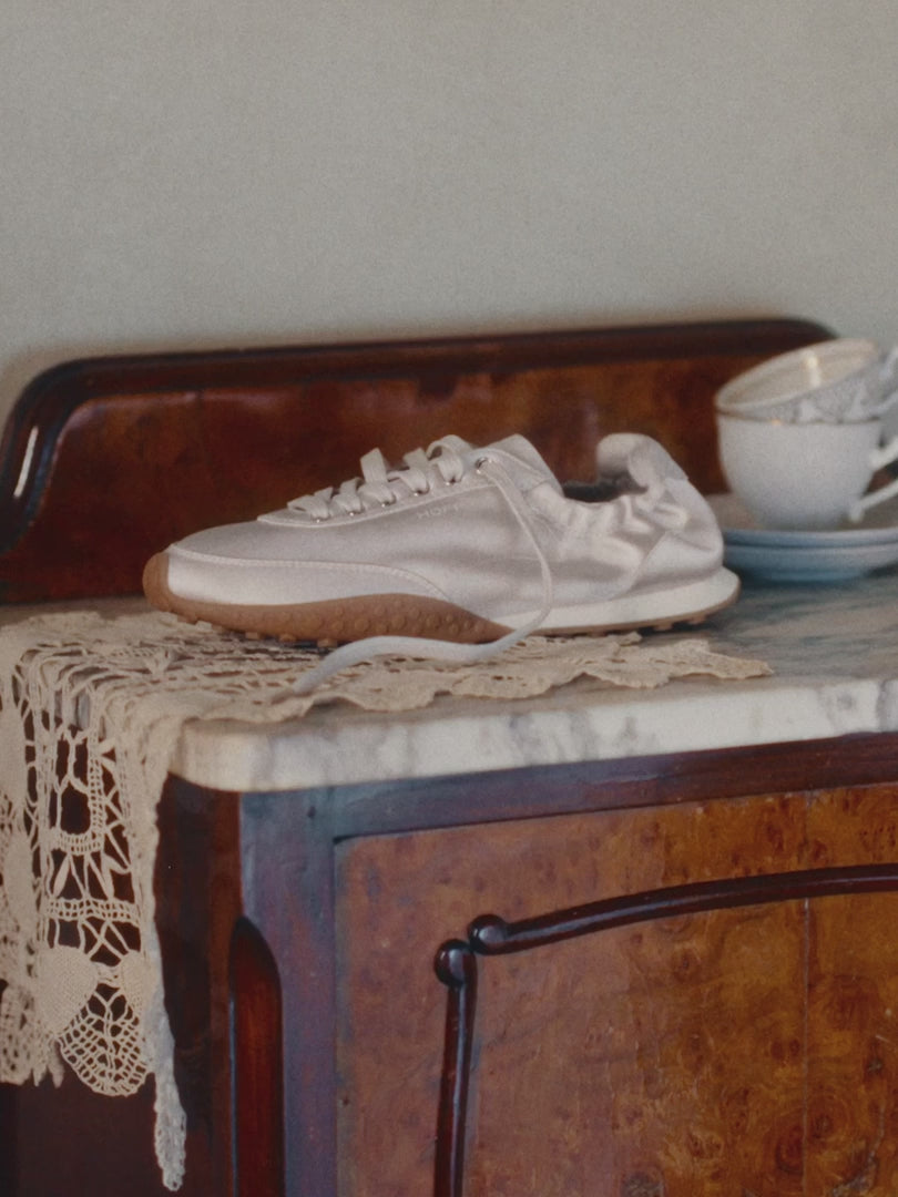 Einfarbiger Sneaker aus Satin und Leder. Rückseite mit Logodetail und elastischem Raffungseinsatz für besseren Halt. Profilierte Sohle. Ton-in-Ton-Schnürverschluss.